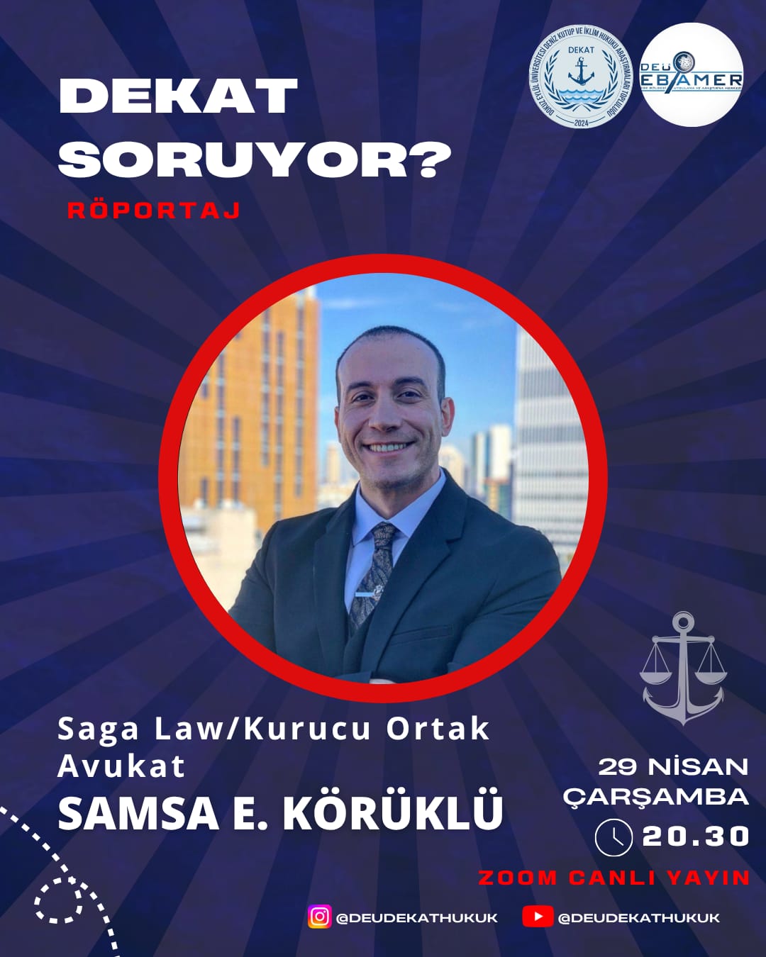 29.04.2026 Çarşamba – 20.30 – “DEKAT Soruyor? / Av. Samsa Emin KÖRÜKLÜ” isimli kariyer söyleşisi WEBİNAR etkinliği olarak DEÜ DEKAT ve DEÜ EBAMER işbirliğinde düzenlemiştir.