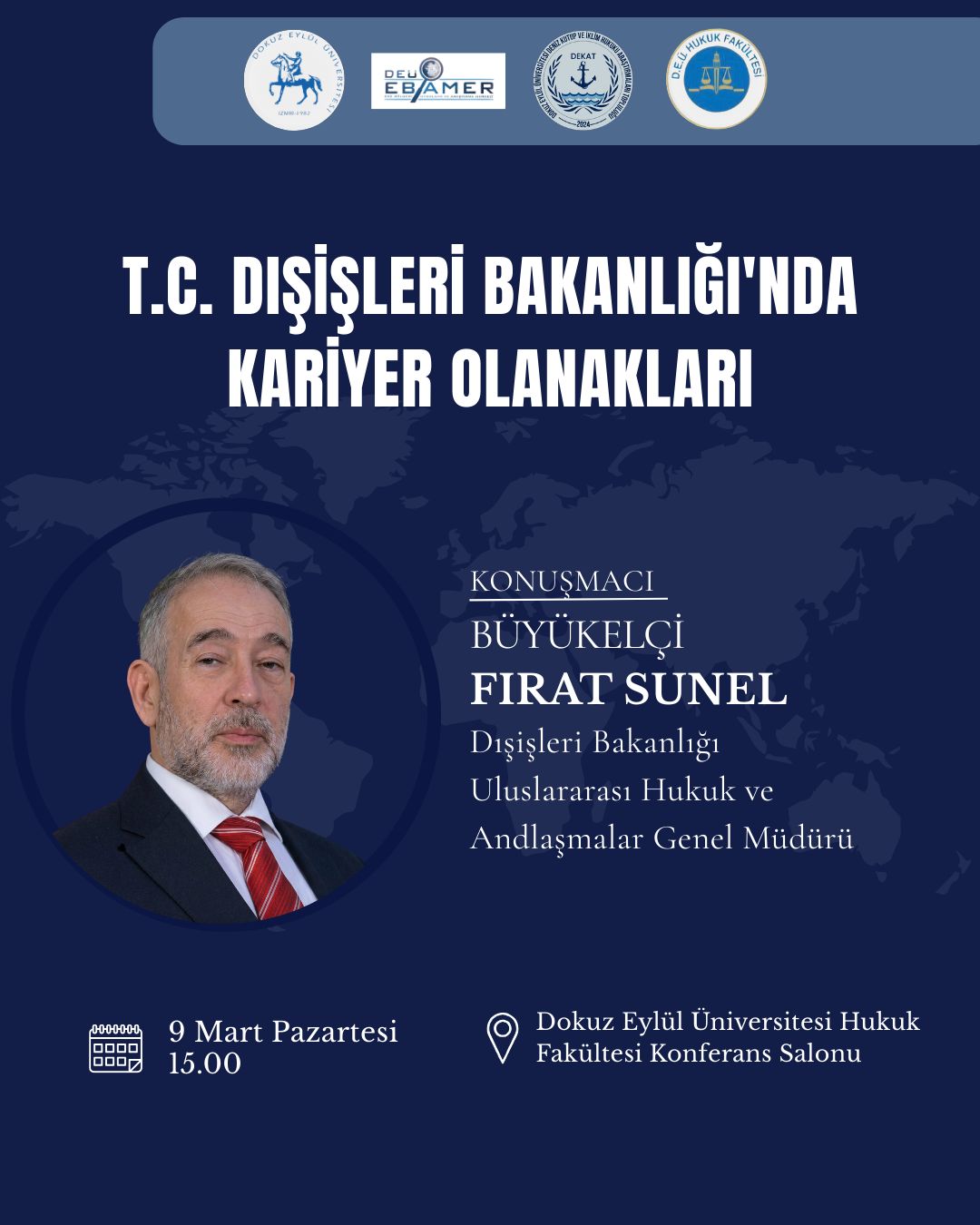 09.03.2026 Pazartesi – 15.00 – “T.C. Dışişleri Bakanlığı’nda Kariyer Olanaklar” isimli kariyer söyleşisi Dokuz Eylül Üniversitesi Hukuk Fakültesi Dekanlığı, DEÜ EBAMER ve DEÜ DEKAT işbirliğinde T.C. Dışişleri Bakan